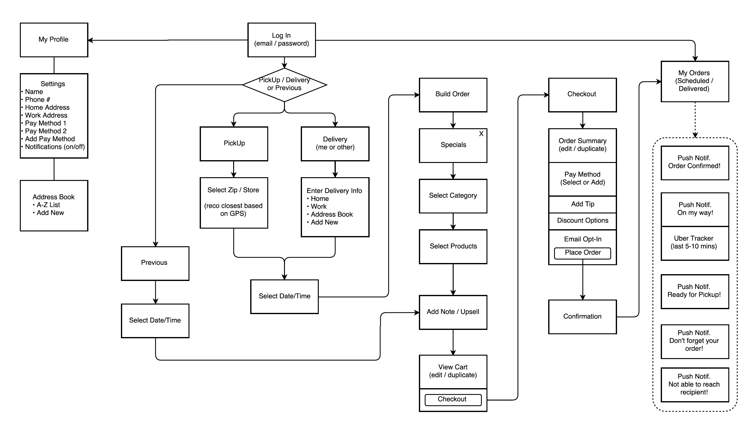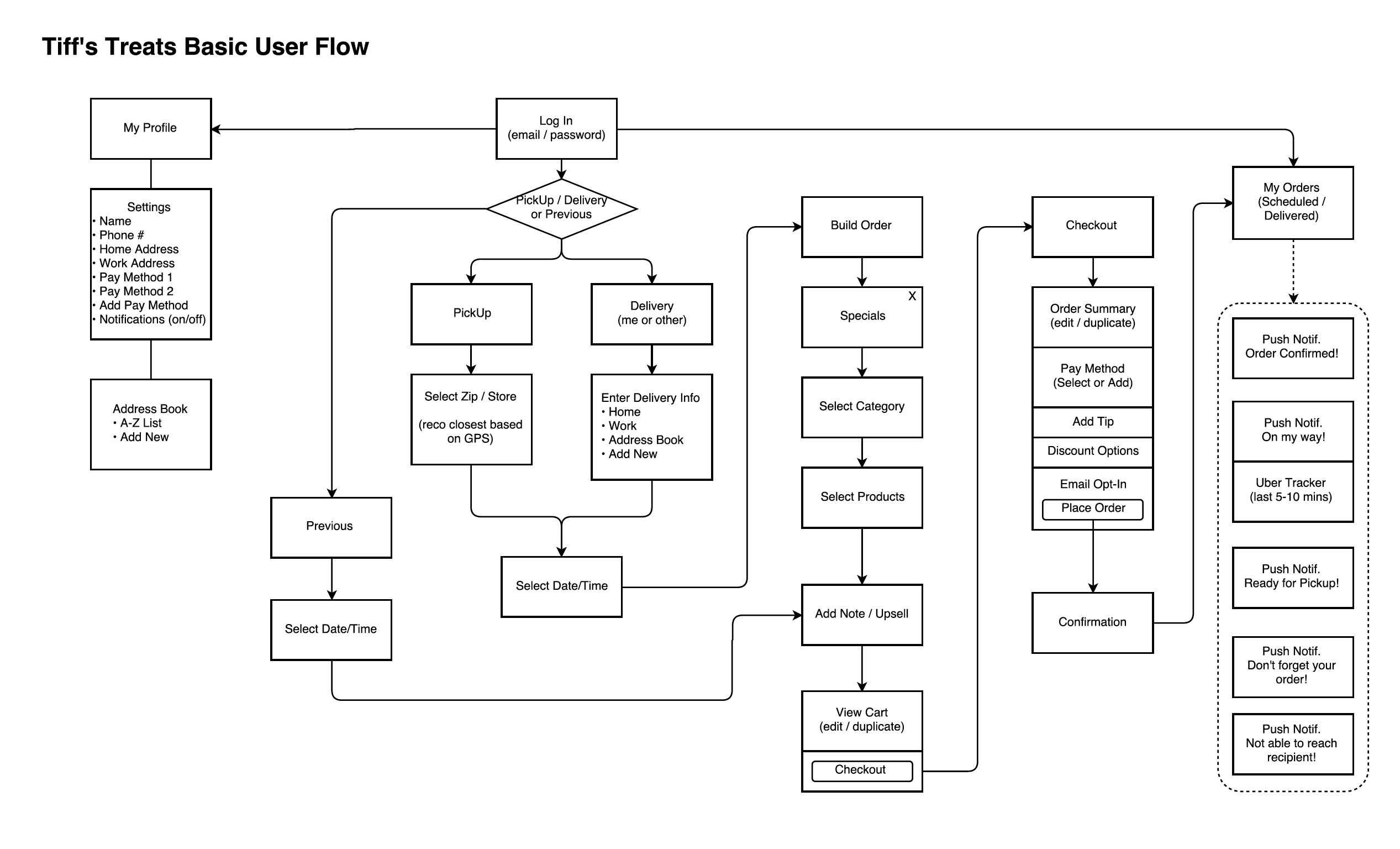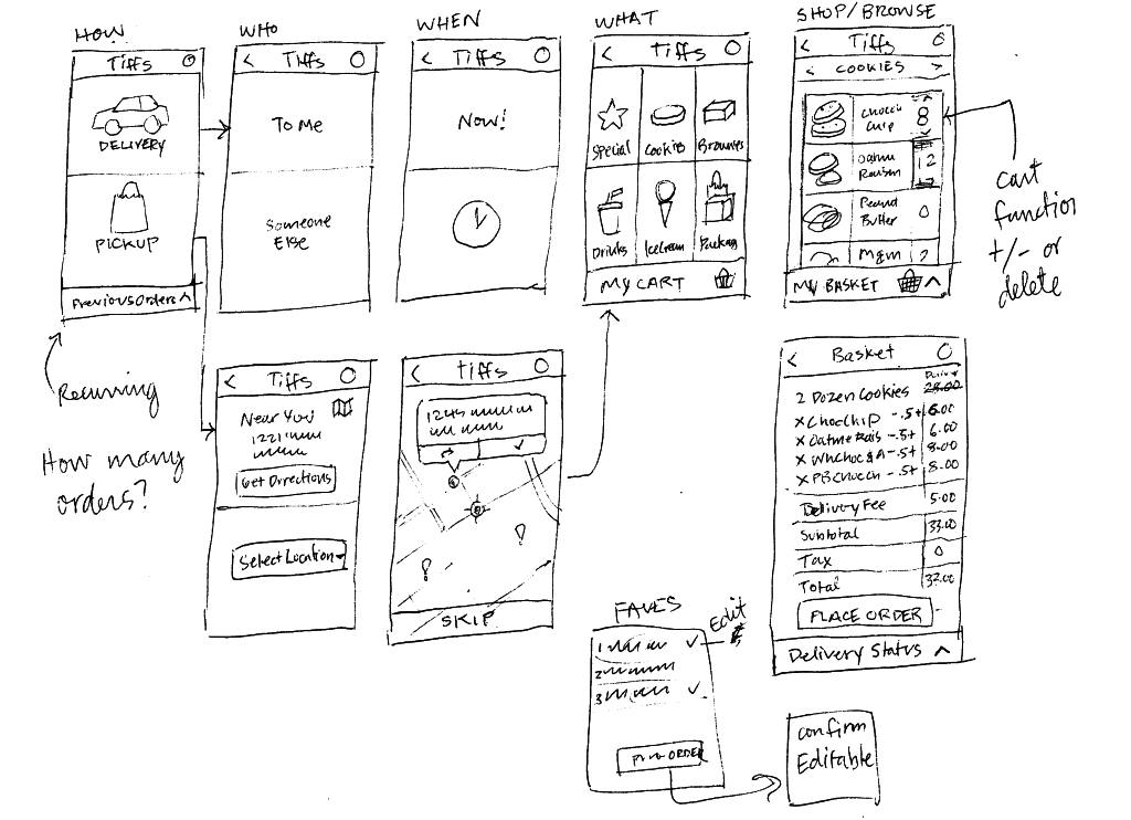 After a deep dive into the Tiff’s business model it became clear that we would need to capture the who, where and when before we could get into the actual cookie selection. This lead to a simple forked navigation up front which leveraged Tiff’s ubiquitous white box and blue ribbon brand image. Chief among many features of the app, users are able to easily repeat previous orders, manage their address book of recipients, and even track the delivery of their treats with a map and notifications.